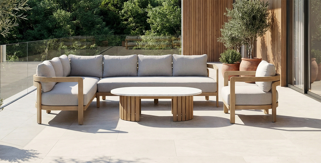 Srdcem této soupravy je velkoryse řešená rohová zahradní sedačka, která je chytře složena ze dvou samostatných zahradních pohovek. Toto modulární řešení umožňuje snadnou manipulaci. Dominantou celé sestavy je její robustní konstrukce z kvalitního akáciového dřeva, která působí vzdušně a zároveň stabilně. Klíčovým prvkem, který tuto soupravu odlišuje, je mimořádně silné a hluboké polstrování sedáků i opěrek. Měkké, ale pevné polštáře poskytují bezkonkurenční pohodlí, které vás bude lákat k dlouhým hodinám odpočinku, čtení knihy nebo konverzaci s blízkými. Potahy z vysoce odolné venkovní textilie jsou nejen příjemné na dotek, ale také navrženy tak, aby odolávaly povětrnostním vlivům a snadno se udržovaly.