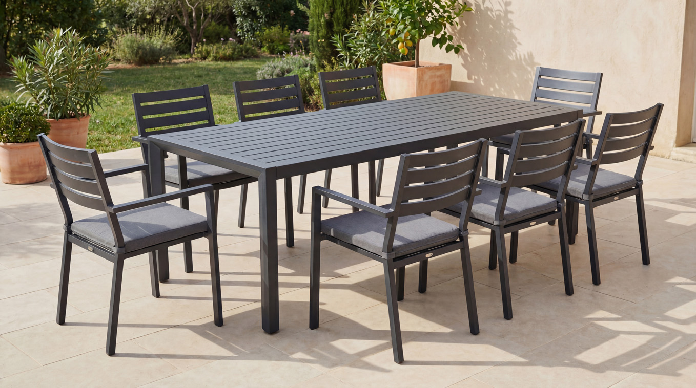 Hliníkový zahradní nábytek Martana - proměňte svou terasu, zahradu nebo prostor u bazénu v elegantní venkovní jídelnu s naší odolnou zahradní sestavou Martana8. Tento moderní hliníkový zahradní nábytek je navržen tak, aby dokonale skloubil funkčnost, minimalistický design a mimořádnou životnost. Sestava je ideální volbou pro každého, kdo hledá bezúdržbové a stylové řešení pro Váš venkovní prostor. Tento zahradní set se skládá z prostorného stolu pro celou rodinu (220 cm) a 8 hliníkových židlí s polstry. Zapomeňte na starosti s korozí nebo blednutím barev či složité čištění stolové desky. Celá sestava, včetně stolu i židlí, je vyrobena z kvalitního hliníku s antracitovou povrchovou úpravou. Tento materiál je lehký, ale zároveň extrémně pevný. Perfektně odolává povětrnostním vlivům, dešti, mrazu i přímému UV záření, což z něj činí ideální volbu pro celoroční venkovní použití. Sestava zahrnuje šest odolných hliníkových židlí, které vynikají nejen svým ergonomickým tvarem, ale i praktičností. Každá židle je doplněna o pohodlný sedací polstr v elegantní šedé barvě, který zvyšuje komfort i při delším sezení. Další výhodou je možnost stohování židlí – po skončení sezóny je snadno naskládáte na sebe a ušetříte tak cenné místo při skladování.
