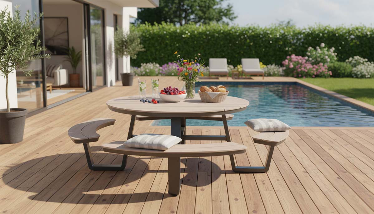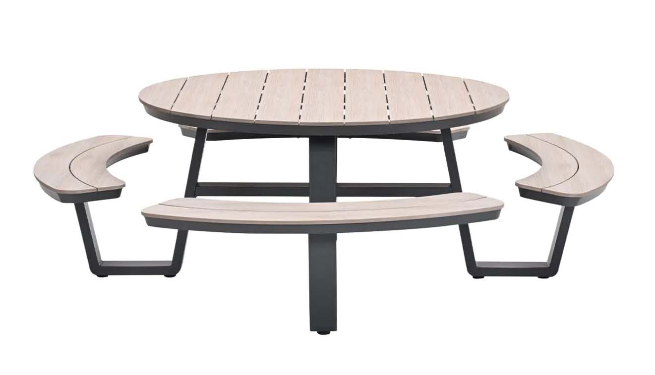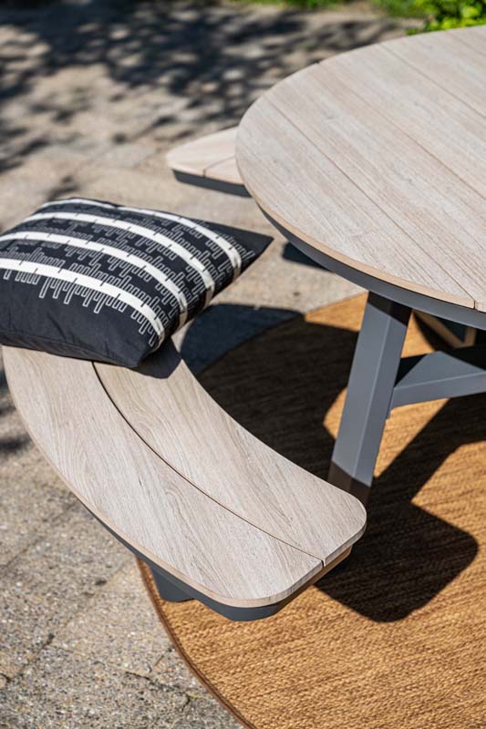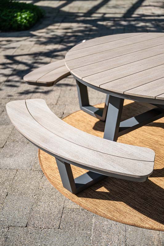 Kulatá zahradní lavice Group pro až 8 osob. Tento piknikový stůl je vyroben z hliníku opatřeného vysoce kvalitním práškovým lakem. Jedná se o kompaktní piknikový set, a je proto ideální na Vaši zahradu, venkovskému domu či jako odopočinkový prostor pro Vaše zaměstance. Deska stolu a sedáky jsou vyrobeny z odolného polywoodu se vzhledem teaku. Polywood je nenáročný na údržbu s krásným vzhledem dřeva, bez nutnosti pravidelné údržby klasického dřeva.