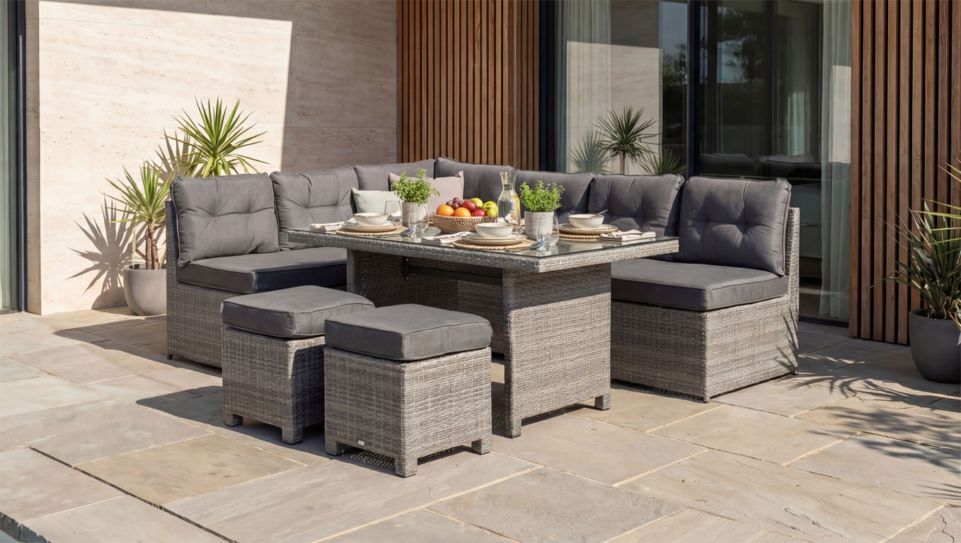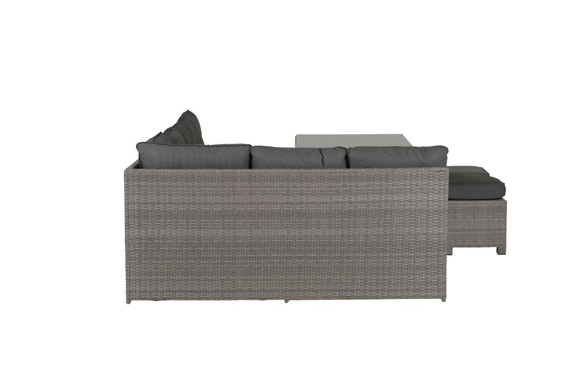 Lounge a jídelní sestava Dante7 nabízí vše pro to pravé letní naladění na vaší vlastní zahradě. Tento všestranný zahradní set kombinuje pohodlí lounge nábytku s praktickou výškou jídelního stolu. Můžete tak bezstarostně odpočívat, ale i posedět s rodinou či přáteli u dobrého jídla a pití.