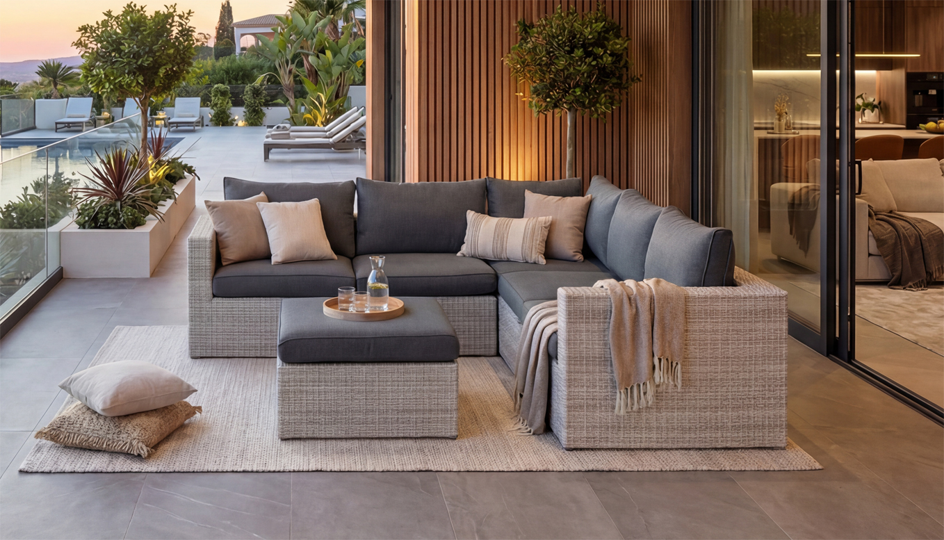 Základem nábytku Adria5 je odolná konstrukce z hliníkového rámu, který zajišťuje nízkou hmotnost pro snadnou manipulaci a zároveň odolnost vůči korozi a nepříznivým vlivům počasí. Povrch tvoří kvalitní umělý ratan s vysokou barevnou stálostí, který nevyžaduje náročnou údržbu. O maximální pohodlí se starají bohatě plněné polstry z prémiových materiálů, které jsou navrženy pro dlouhou životnost a vysoký komfort při každém usednutí. Díky nadčasovému designu a neutrálním barvám se tato sestava stane elegantní dominantou každé moderní terasy či zahrady.