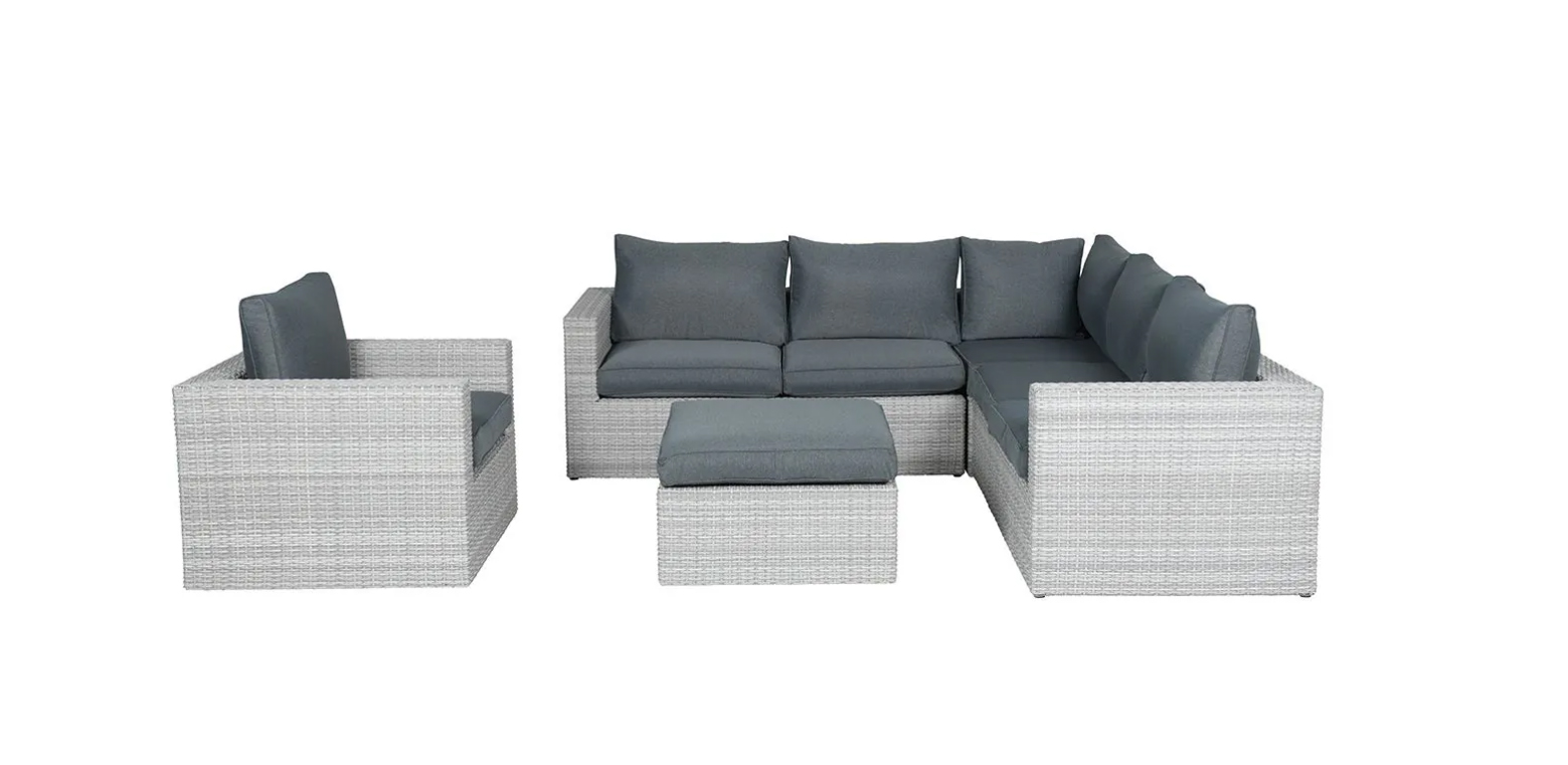 Ratanová zahradní sedací souprava Adria6 přináší klasickou praktičnost a pohodlí na Vaši terasu, ať už plánujete velkou rodinnou oslavu nebo komorní odpočinek na slunci. Celý set se skládá z pravé a levé zahradní pohovky, které doplňuje centrální modul. Součástí sestavy je také samostatné prostorné křeslo a praktický taburet s polstrem, který může sloužit jako podnožka i jako plnohodnotné místo k sezení.