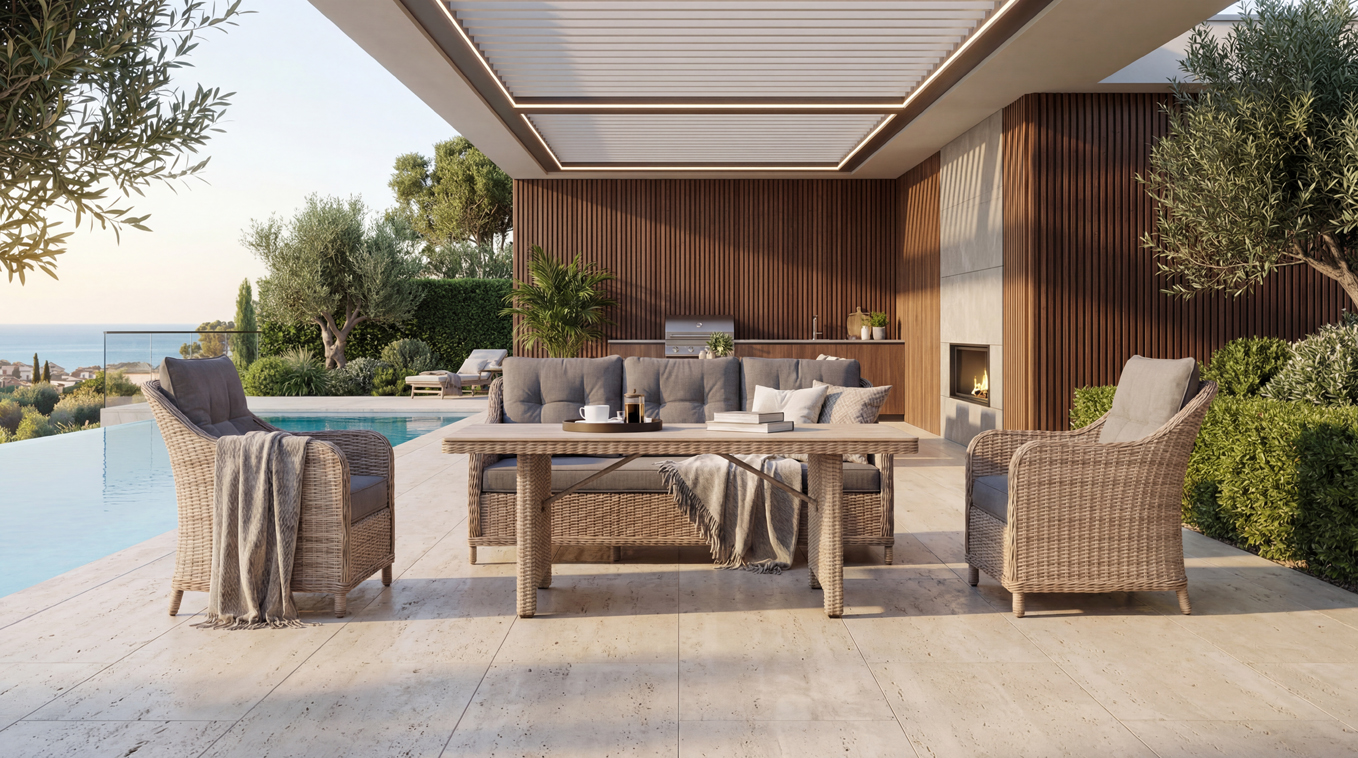 Pohodlná souprava s vysokým stolem a kvalitním polstry promění vaši terasu v oázu.