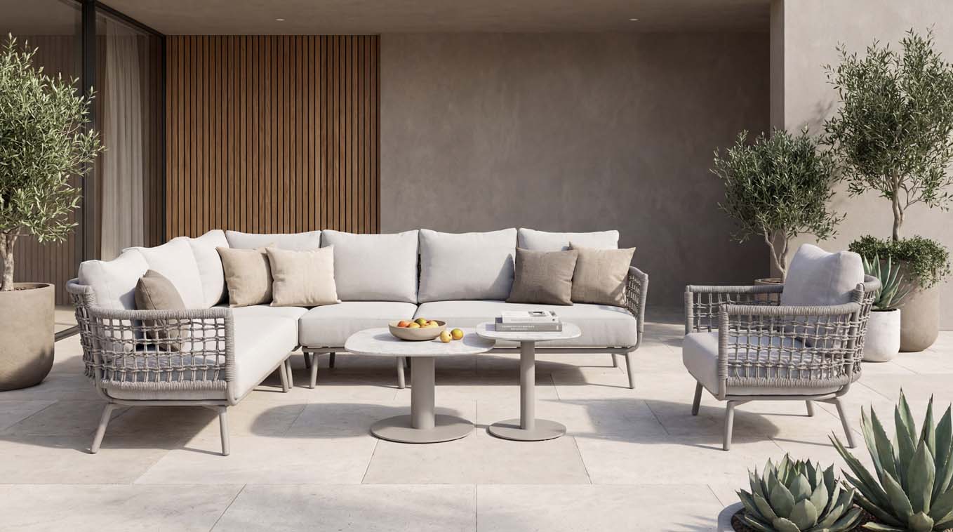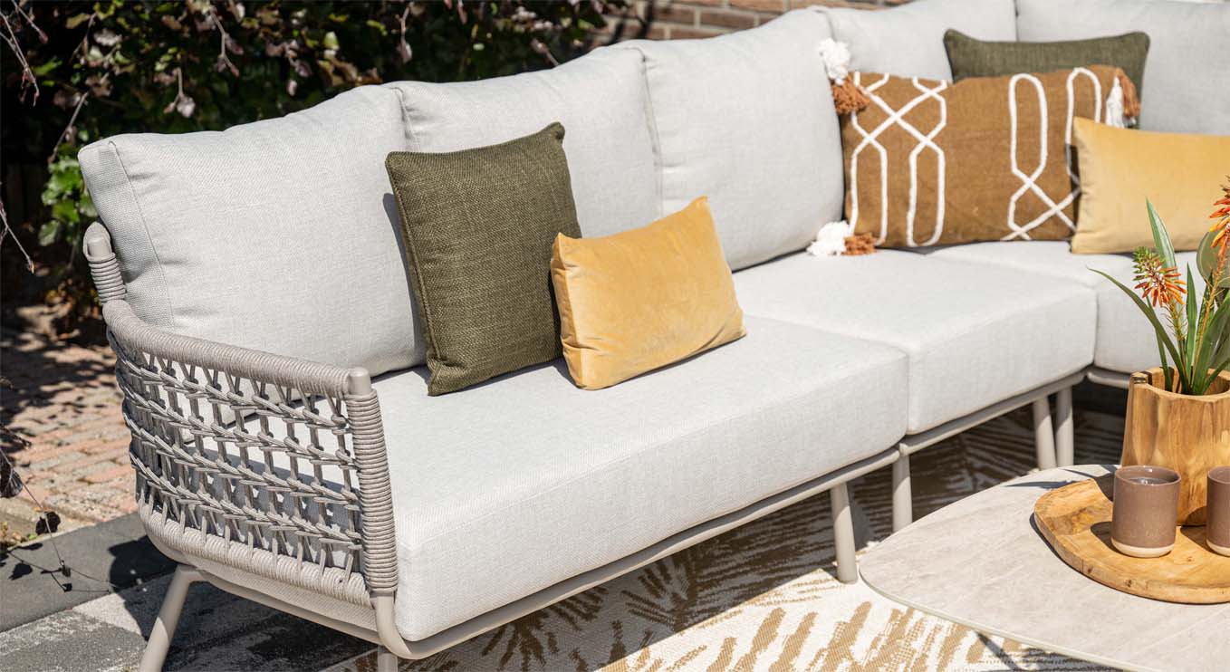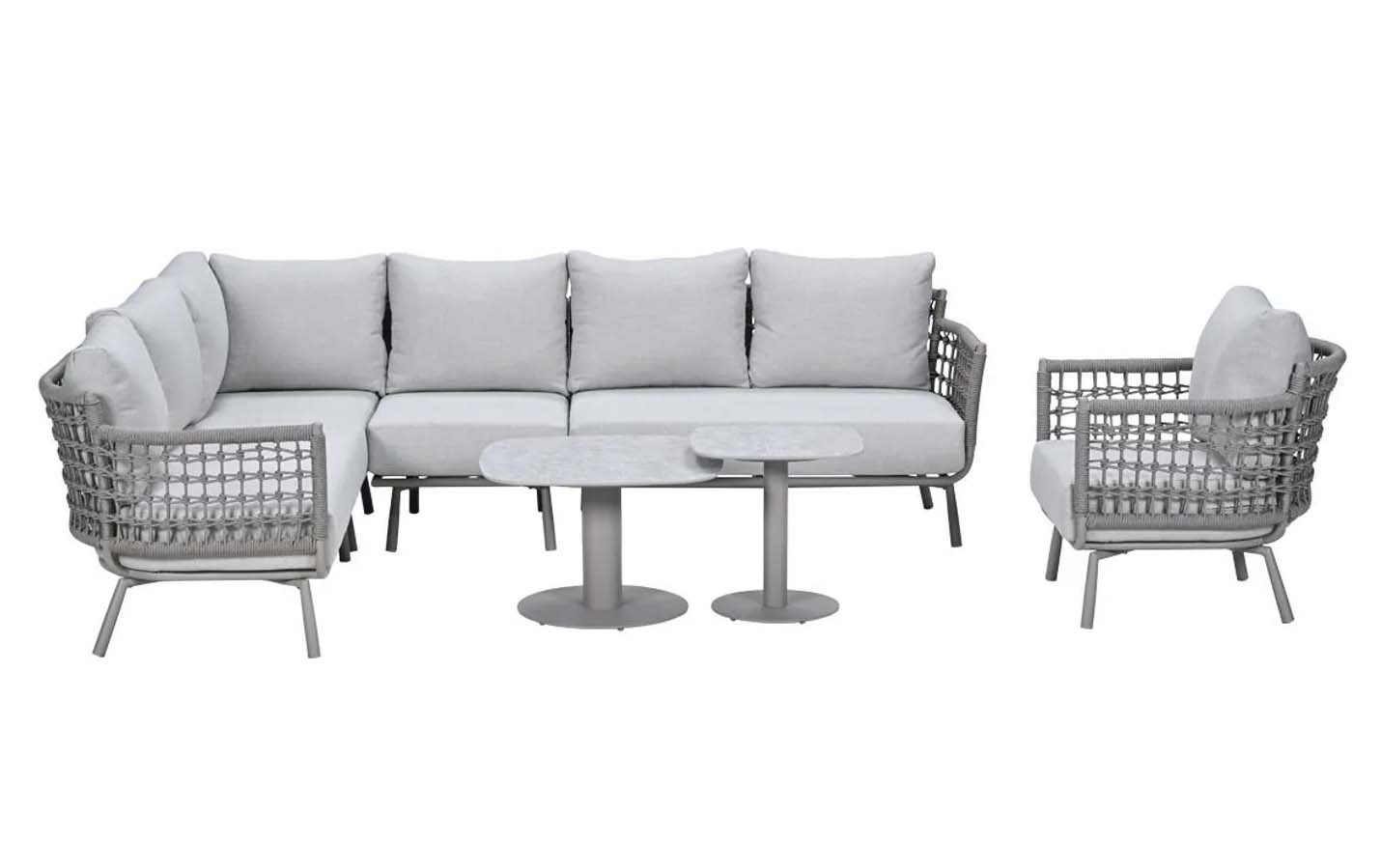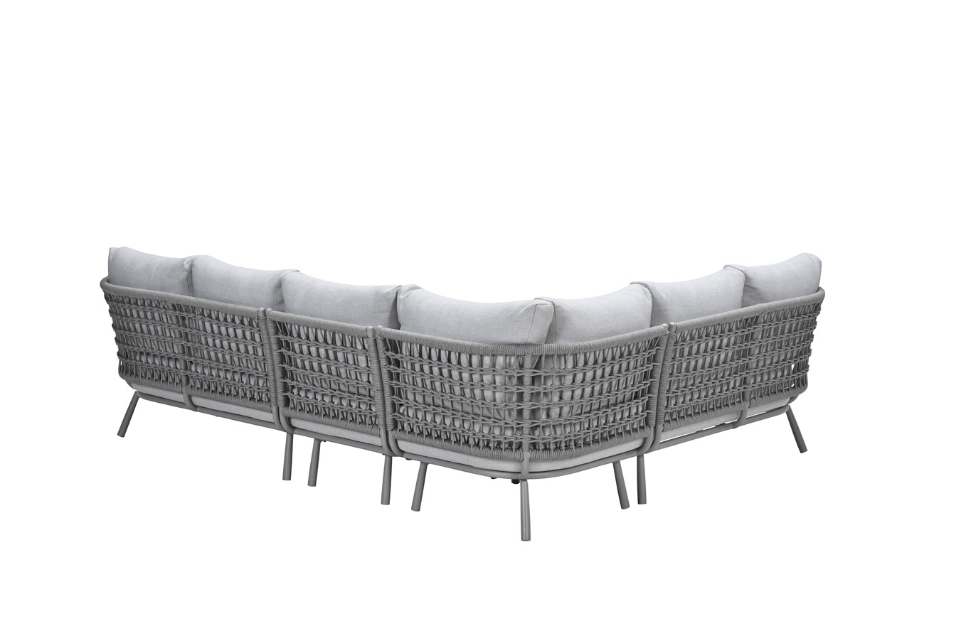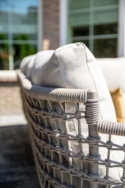 Inovativní Rope výplet: Okouzlující a zároveň vysoce odolný výplet z lana (Rope) v šedo-taupe odstínu dodává sedačce jedinečný charakter a strukturu. Je příjemný na dotek a odolný vůči povětrnostním vlivům. Robustní hliníkový rám: Základem soupravy je lehký, ale mimořádně pevný hliníkový rám v elegantní šedo-taupe barvě. Tento materiál zajišťuje dlouhou životnost, stabilitu a odolnost proti korozi.