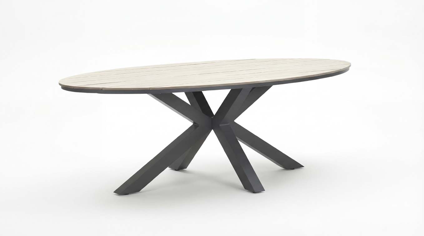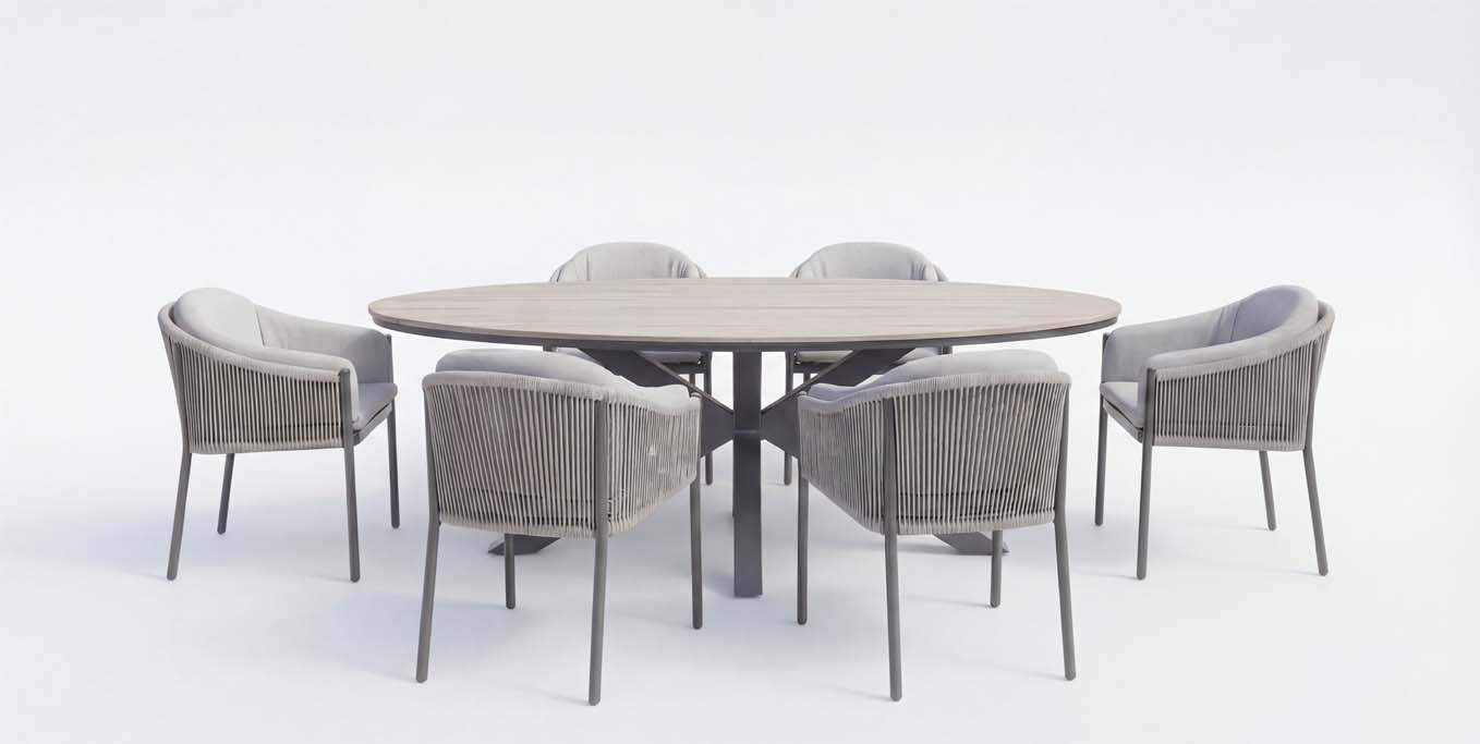 Tato prémiová sestava se stane přirozeným středobodem vaší terasy či zimní zahrady. Dominantou je velkorysý oválný stůl, který díky absenci ostrých rohů vybízí k přátelské konverzaci a pohodlnému usazení až 6 osob. Deska stolu z polywoodu s věrnou náhradou přírodního dřeva dodává sestavě hřejivý nádech. Polywood je odolný vůči vlhkosti, UV záření a dalším vnějším vlivům, vypadá jako dřevo, ale bez pravidelné nutnosti údržby. Robustní centrální podnož z hliníku v antracitové barvě zajišťuje maximální stabilitu a volnost pohybu pro vaše nohy.