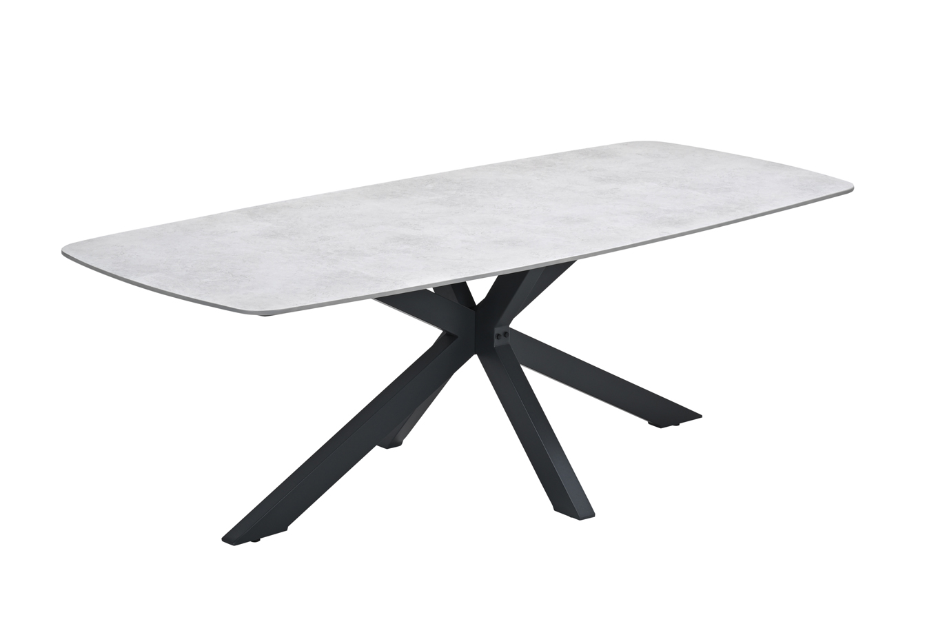 Luxusní venkovní jídelní set pro 6 osob. Designový stůl s deskou Fiberstone v betonovém dekoru a křížovým podnožím doplňují stohovatelné hliníkové židle s textilenem. Odolnost, styl a bezúdržbovost pro vaši terasu.