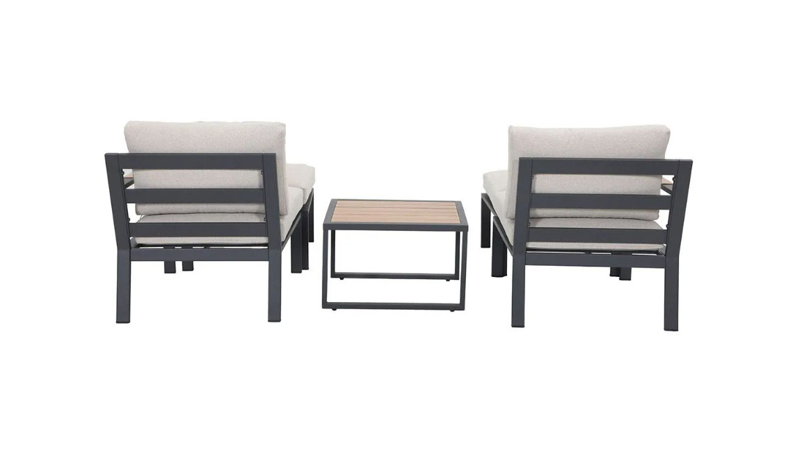 Rám zahradního setu Kora je kompletně vyroben z hliníku, což mu zajišťuje lehkou, pevnou a na údržbu nenáročnou základnu. Odkládací plocha stolku a područky jsou opatřeny povrchem v dokonalé imitaci teakového dřeva, který dodává modernímu, čistému designu hřejivý a přirozený vzhled. Tato kombinace materiálů se perfektně hodí do současných venkovních prostor. Souprava je dodávána s pohodlnými sedáky a opěrnými polštáři.