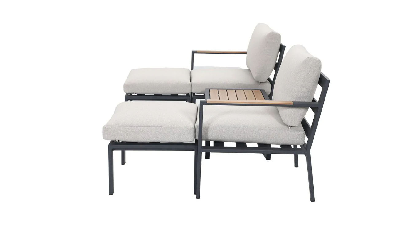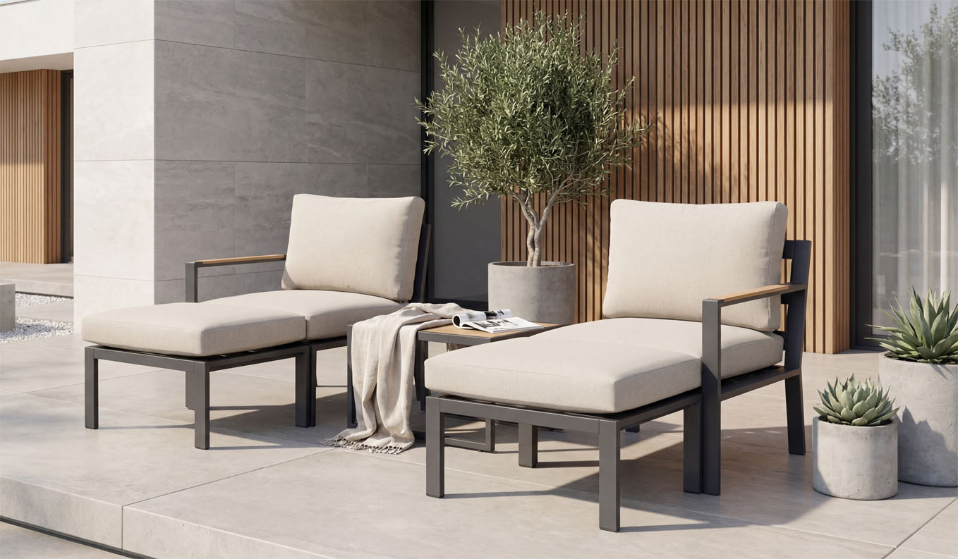 To, co dělá set Kora výjimečným, je jeho flexibilita. Přisunutím křesel a podnožek k sobě vytvoříte během okamžiku kompaktní denní lehátko (daybed). Je to ideální řešení pro pohodlnou relaxaci na slunci nebo pro společné lenošení i na malém prostoru. Samostatné podnožky lze navíc využít jako další místo k sezení nebo jako prodloužení samotného křesla.