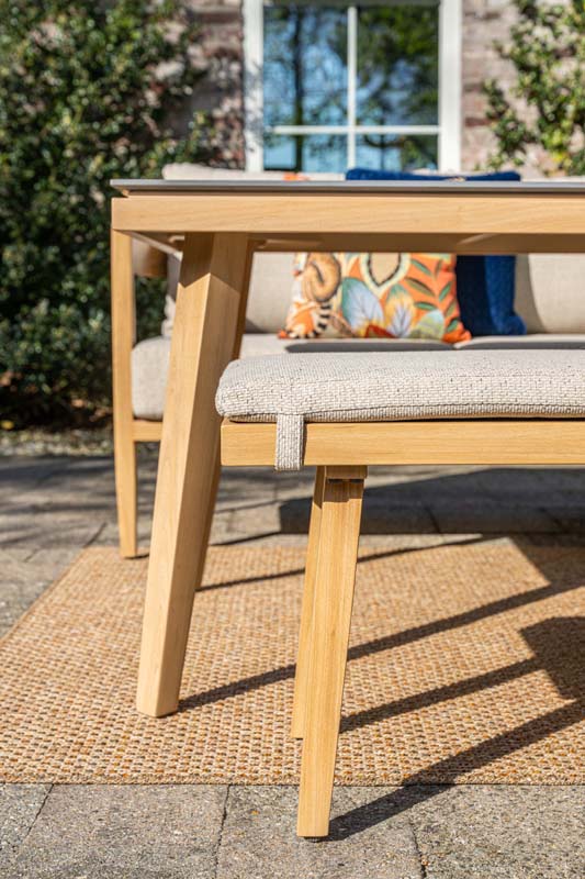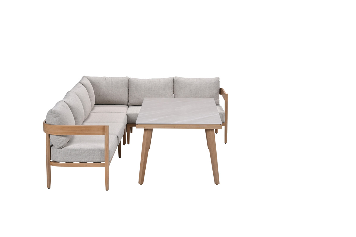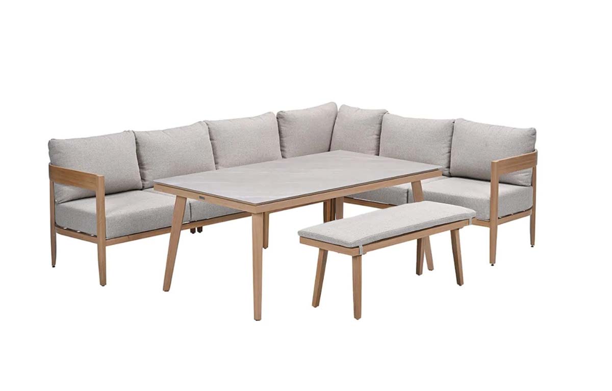 Zahradní sestava Hillston je navržena s důrazem na variabilitu. Skládá se z: pravého dílu pohovky, levého dílu pohovky, centrálního rohového modulu a středového modulu bez područek, kde díky tomuto chytrému prvku můžete pohovku snadno a rychle sestavit jako pravý nebo levý roh přesně podle dispozic vaší terasy. Součástí je navíc praktická lavice, která elegantně rozšiřuje počet míst k sezení a je ideální pro větší společnost nebo pro děti.