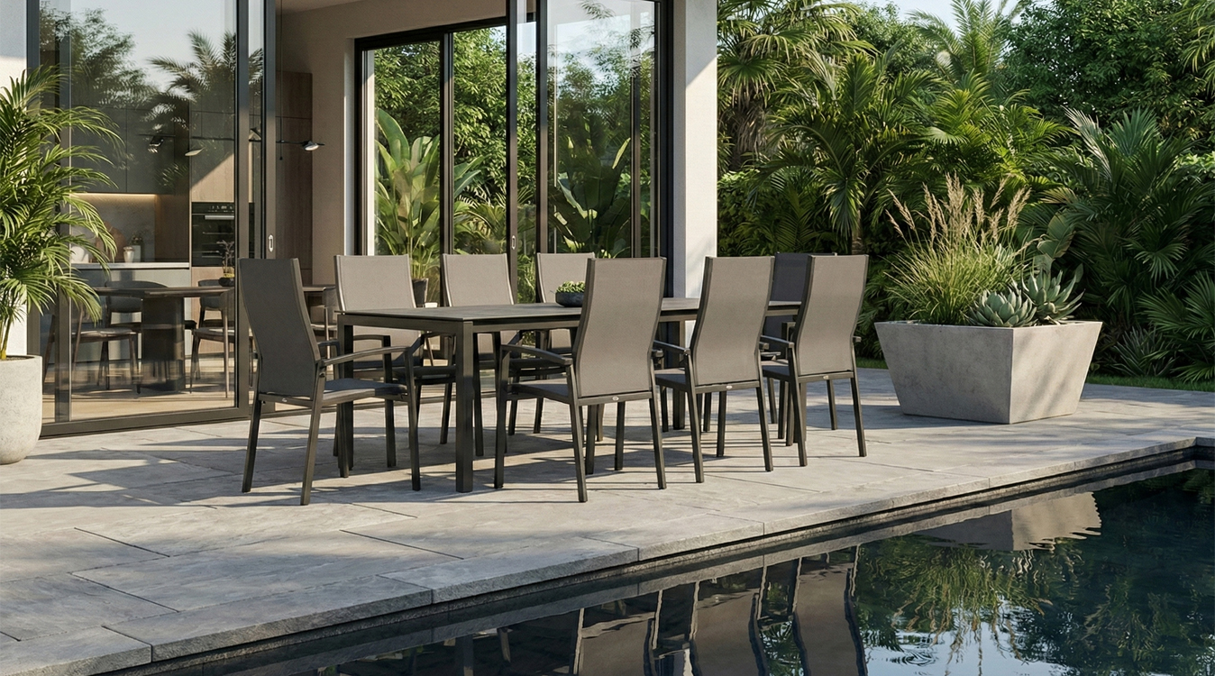 Rozkládací stůl s robustní, hladkou kamenno keramickou deskou má pevný a stabilní ocelový rám, který je mimořádně odolný vůči povětrnostním vlivům s práškovou povrchovou úpravou antracit. Hladká kamenno keramická deska stolu je odolná vůči poškrábání, má elegantní vzhled, snadno se čistí a případné nečistoty či mastnota nezanechává trvalý otisk! Díky praktickým vodicím lištám lze stůl rychle a bez námahy rozložit, přičemž vložky lze v několika jednoduchých krocích uložit pod desku stolu.