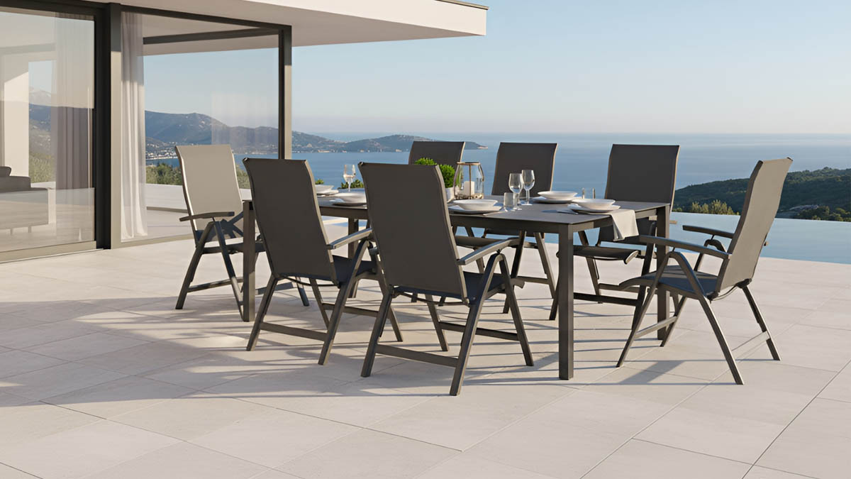 Rozkládací stůl má pevný a stabilní ocelový rám, který je mimořádně odolný vůči povětrnostním vlivům, pozinkovaný a povrchově upravený. Kamenno keramická deska stolu je odolná vůči poškrábání a má elegantní vzhled a snadno se čistí! Díky praktickým vodicím lištám lze stůl rychle a bez námahy rozložit, přičemž vložky lze v několika jednoduchých krocích uložit pod desku stolu.