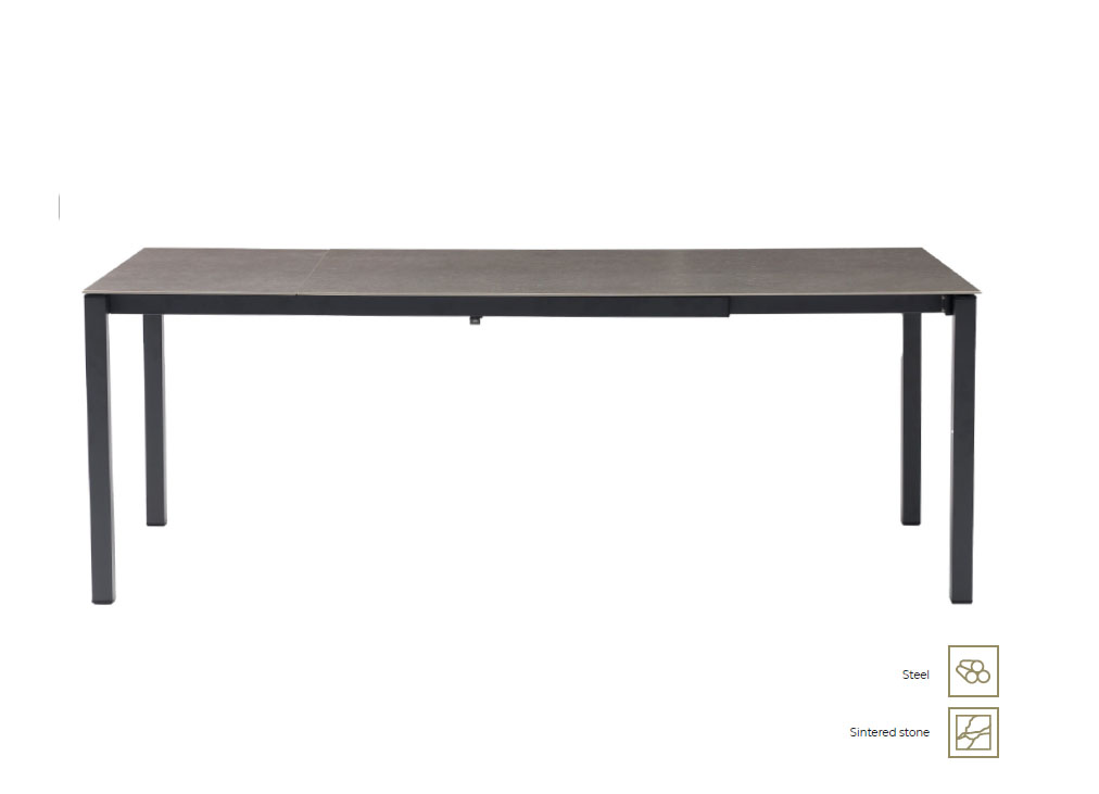 Rozkládací stůl s robustní, hladkou deskou Sintered Stone, který je nástupcem klasických keramických desek, má pevný a stabilní ocelový rám, který je mimořádně odolný vůči povětrnostním vlivům s práškovou povrchovou úpravou antracit, váha stolu ca 60kg! Hladká kamenno keramická deska stolu je odolná vůči poškrábání, má elegantní vzhled, snadno se čistí a případné nečistoty či mastnota nezanechává trvalý otisk! Díky praktickým vodicím lištám lze stůl rychle a bez námahy rozložit, přičemž rozšiřujíci modul lze v několika jednoduchých krocích uložit pod desku stolu. Obrovskou výhodou toho jídelního stolu je, že vysunejete celý rám a tím zajistíte plnohodnotné zvětšení stolu.