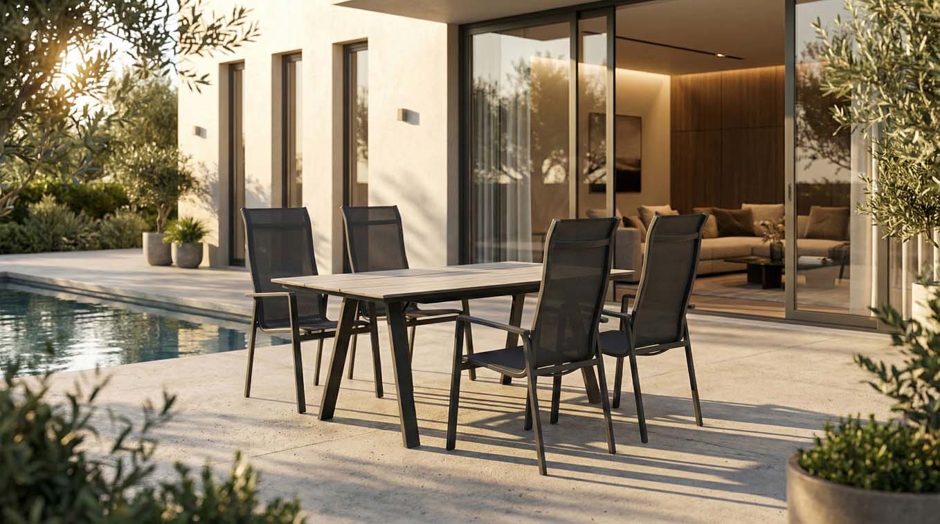 Proměňte svou terasu nebo zahradu v dokonalé místo pro setkávání a stolování s touto kvaitní zahradní jídelní soupravou. Navržena pro styl, komfort a dlouhou životnost, je ideální volbou pro každého, kdo hledá kvalitní, odolný a praktický venkovní nábytek.