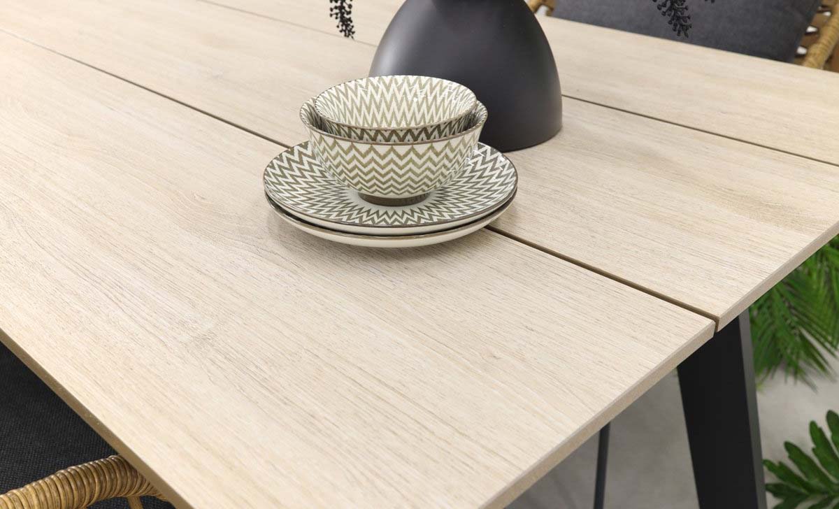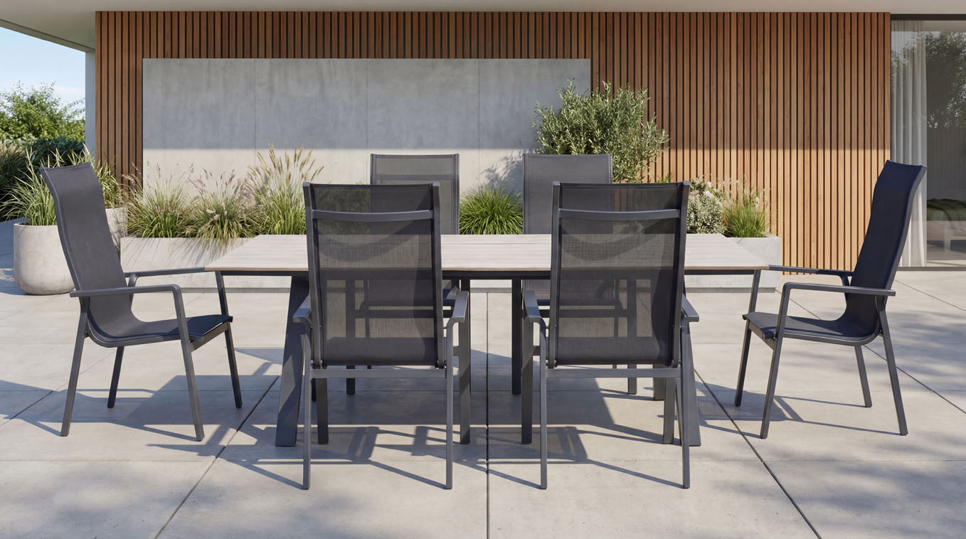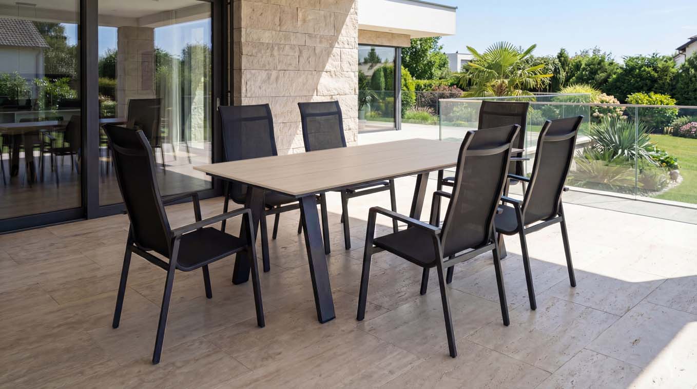 Robustní hliníkový stůl o velikosti 205 cm s deskou Polywood: centrem soupravy je elegantní hliníkový stůl, který je lehký, stabilní a odolný vůči povětrnostním vlivům. Deska z moderního Polywoodu dokonale nahrazuje přírodní dřevo, ale bez náročné údržby. Je rezistentní vůči UV záření, dešti i mrazu, což zaručuje krásný vzhled po mnoho let.