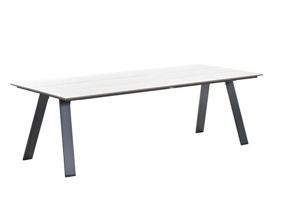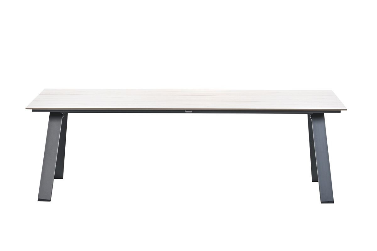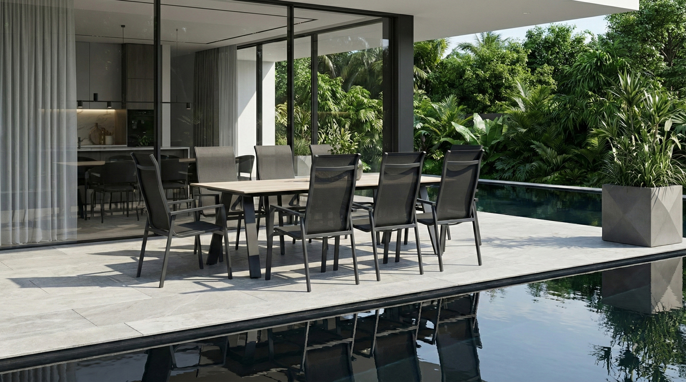 Robustní hliníkový stůl o velikosti 240 cm s deskou Polywood: Srdcem soupravy je elegantní hliníkový stůl, který je lehký, stabilní a odolný vůči povětrnostním vlivům. Deska z moderního Polywoodu dokonale nahrazuje přírodní dřevo, ale bez náročné údržby. Je rezistentní vůči UV záření, dešti i mrazu, což zaručuje krásný vzhled po mnoho let.