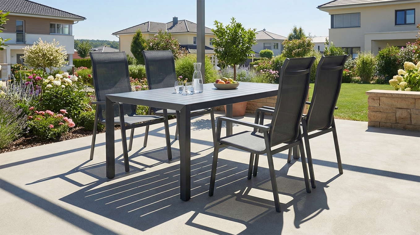 Kompaktní stůl (160 cm): Prostorný jídelní stůl poskytuje pohodlné místo pro 4 až 6 osob. Jeho robustní hliníková konstrukce je 100% bezúdržbová a snadno se čistí.