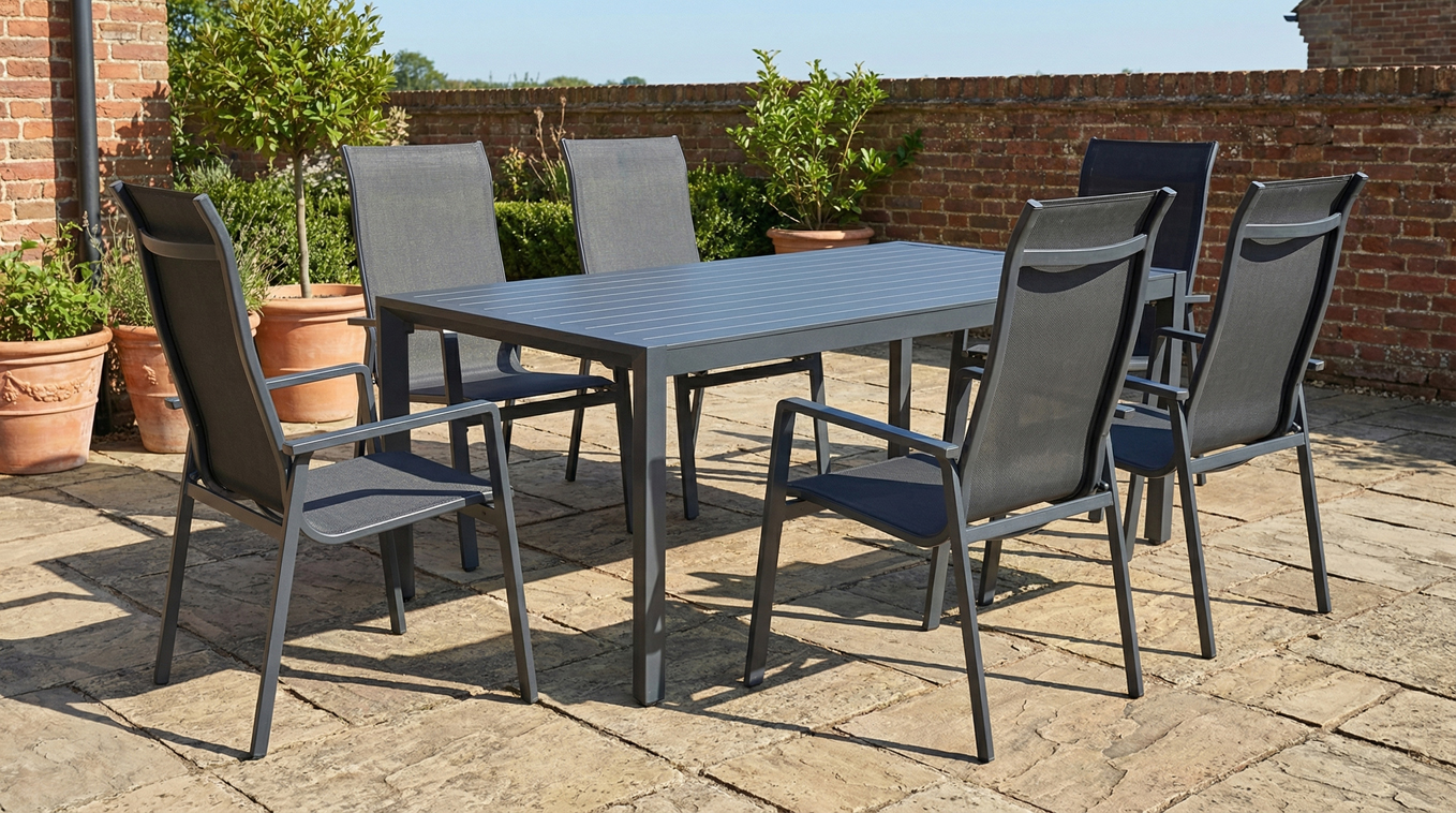 Dopřejte si luxusní stolování pod širým nebem s moderní hliníkovou soupravou Linea s vysokou opěrkou. Tento elegantní jídelní set kombinuje minimalistický design s maximálním komfortem a bezkonkurenční odolností. Díky stolu o délce 160 cm a šesti vysoce komfortním křeslům je ideální volbou pro rodinné obědy, večerní grilování i setkání s přáteli.
