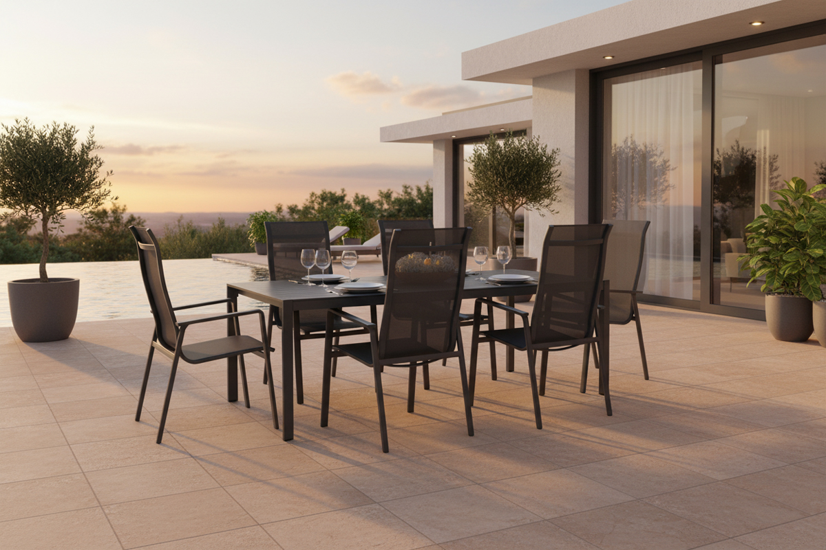 Dopřejte si luxusní stolování pod širým nebem s moderní hliníkovou soupravou Linea. Tento elegantní jídelní set kombinuje minimalistický design s maximálním komfortem a bezkonkurenční odolností. Díky velkorysému stolu o délce 220 cm a šesti vysoce komfortním křeslům je ideální volbou pro rodinné obědy, večerní grilování i setkání s přáteli.