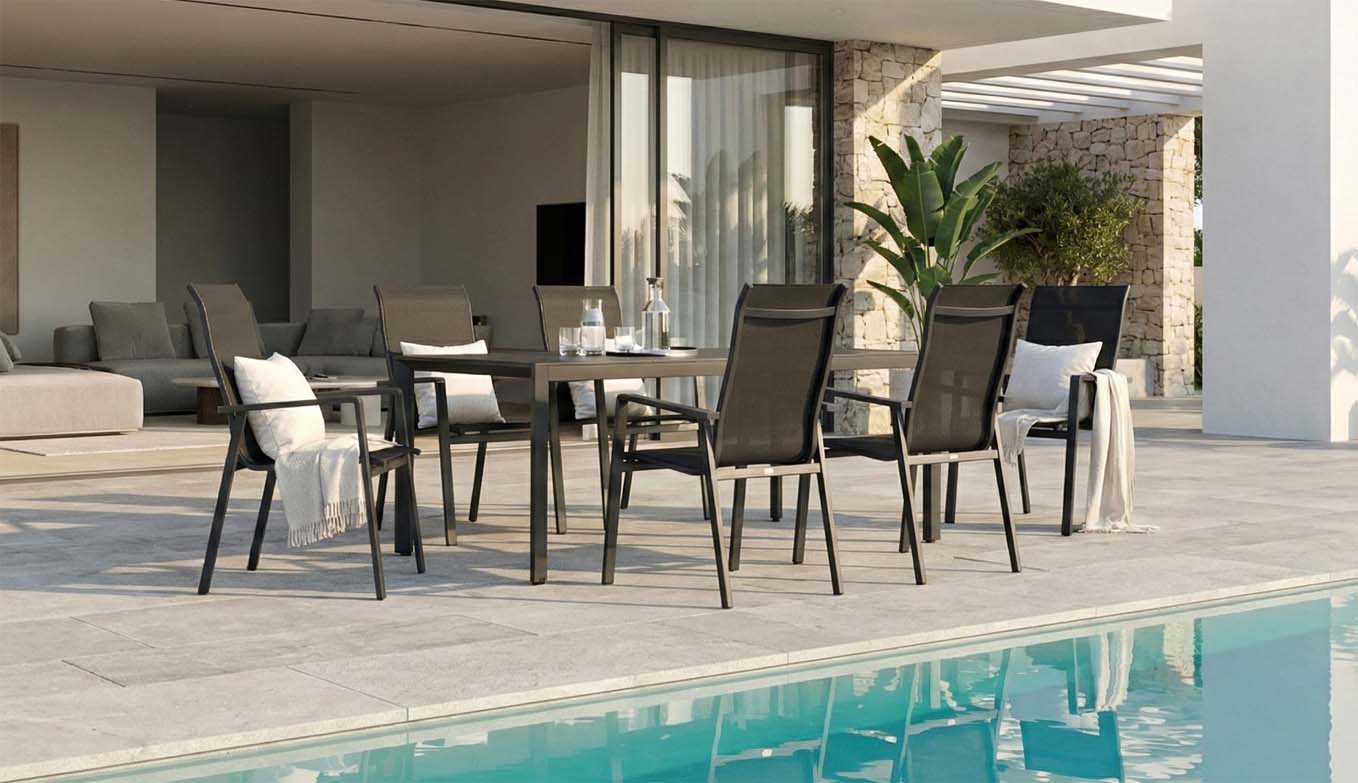 Velký stůl (220 cm): Prostorný jídelní stůl poskytuje pohodlné místo pro 6 až 8 osob. Jeho robustní hliníková konstrukce je 100% bezúdržbová a snadno se čistí.