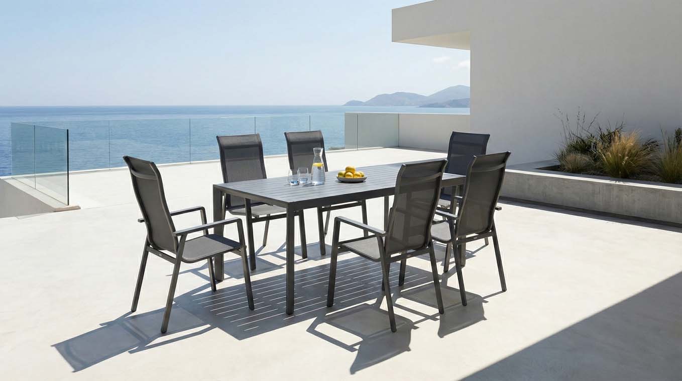 Dopřejte si luxusní stolování pod širým nebem s moderní hliníkovou soupravou Linea s vysokou opěrkou. Tento elegantní jídelní set kombinuje minimalistický design s maximálním komfortem a bezkonkurenční odolností. Díky velkorysému stolu o délce 220 cm a šesti vysoce komfortním křeslům je ideální volbou pro rodinné obědy, večerní grilování i setkání s přáteli.
