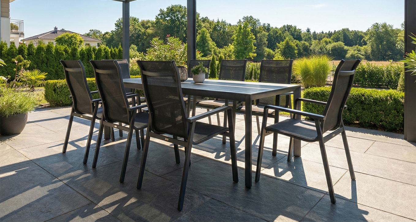 Moderní zahradní nábytek Linea8 s vysokou opěrkou - dopřejte si luxusní stolování pod širým nebem. Tento elegantní jídelní set kombinuje minimalistický design s maximálním komfortem a bezkonkurenční odolností. Díky velkému stolu o délce 220 cm a šesti vysoce komfortním křeslům je ideální volbou pro rodinné obědy, večerní grilování i setkání s přáteli.