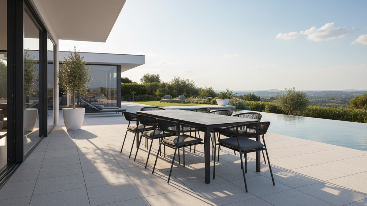 Rozkládací stůl s robustní, hladkou kamenno keramickou deskou má pevný a stabilní ocelový rám, který je mimořádně odolný vůči povětrnostním vlivům s práškovou povrchovou úpravou antracit. Hladká kamenno keramická deska stolu je odolná vůči poškrábání a má elegantní vzhled a snadno se čistí a případné nečistoty či mastnota nezanechavá trvalý otisk! Díky praktickým vodicím lištám lze stůl rychle a bez námahy rozložit, přičemž vložky lze v několika jednoduchých krocích uložit pod desku stolu.