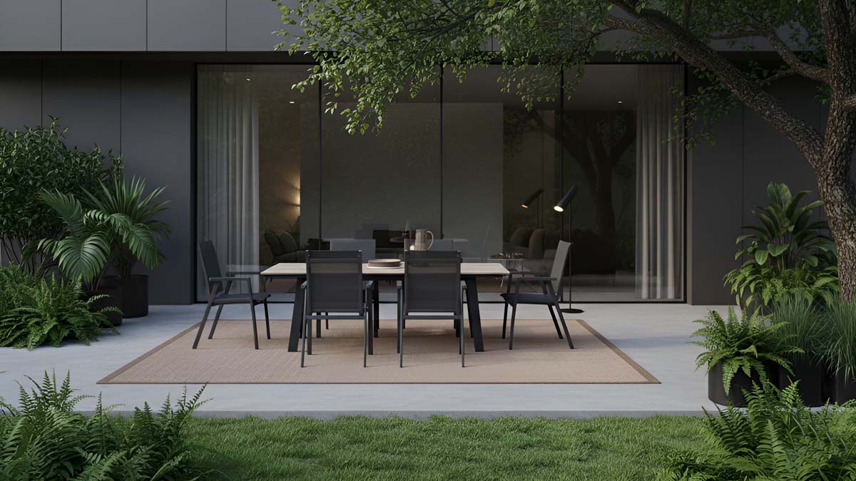 Dominantou této exkluzivní soupravy je velkorysý jídelní stůl s délkou 205 cm. Jeho deska vyrobená z moderního materiálu polywood přináší hřejivou estetiku dřeva bez starostí s pravidelným natíráním či impregnací. Je odolná vůči UV záření, dešti i změnám teplot. Stabilitu zajišťuje pevná hliníková konstrukce s elegantní designovou podnoží, která nejen skvěle vypadá, ale také poskytuje dostatek prostoru pro nohy.
