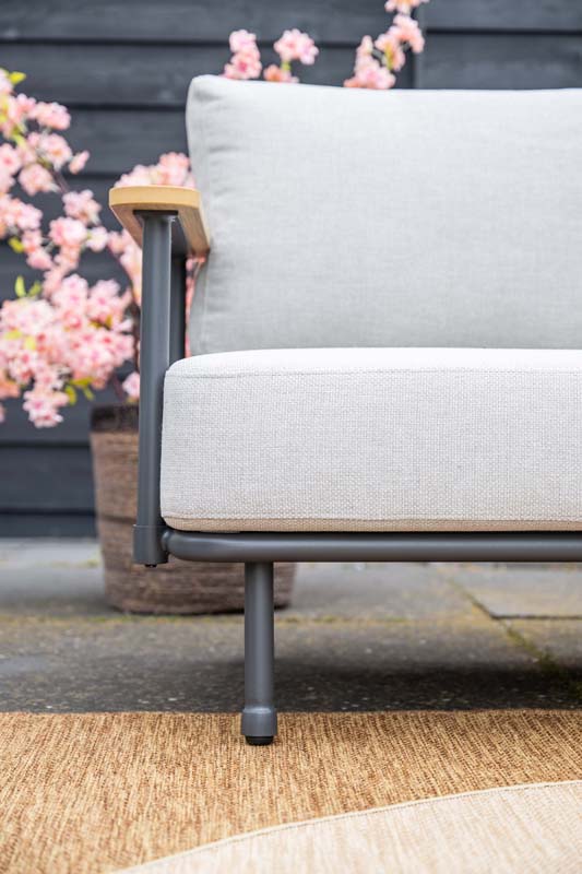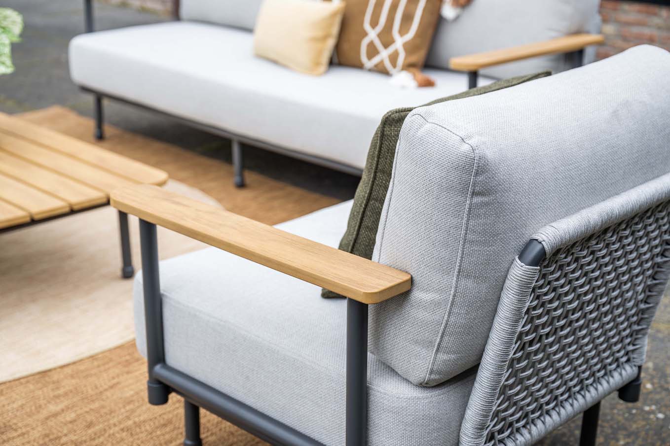 Design, který zaujme dominantou sestavy je vzdušný rope výplet na zádových opěrkách, který nábytku dodává lehkost a jedinečnou texturu. V kombinaci s pevnou hliníkovou konstrukcí v tmavém odstínu působí celek elegantně a nadčasově. Teplý dotek přírody přináší prvky z polywoodu na područkách a stolové desce.