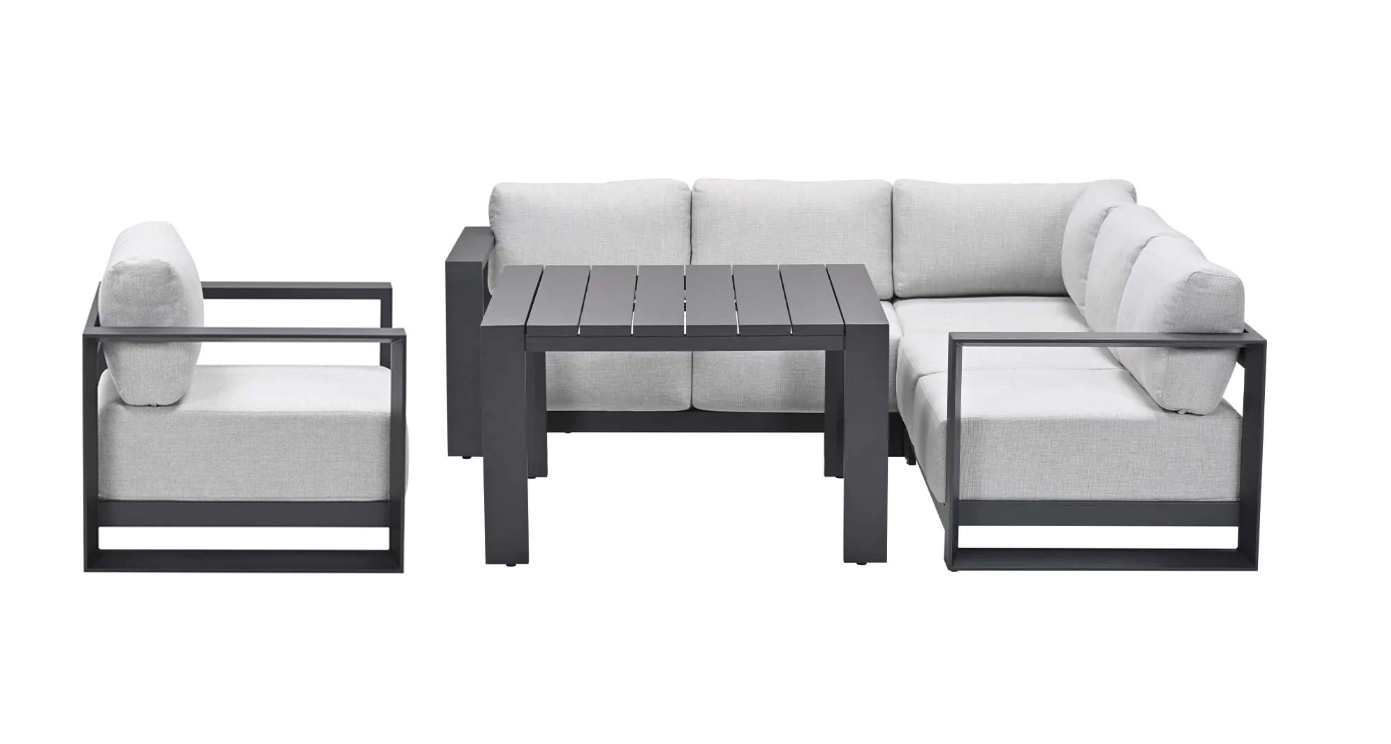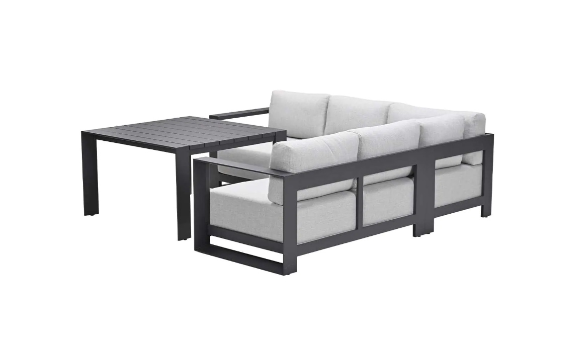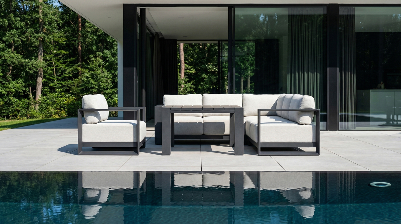 Vytvořte si na zahradě či terase luxusní venkovní obývací pokoj, který nebudete chtít opustit. Zahradní sedací souprava Accordia Corner6 je ztělesněním moderního minimalismu a funkčnosti. Tato velkorysá rohová sestava, doplněná o samostatné křeslo a praktický vysoký stůl, přináší nekompromisní pohodlí pro Vaši rodinu i přátele. Accordia Corner6 zaujme na první pohled svými čistými, geometrickými liniemi. Robustní hliníkový rám v elegantním tmavém odstínu (antracit) tvoří dokonalý kontrast se světlým, nadýchaným polstrováním. Tento monochromatický design se skvěle hodí k moderní architektuře, k bazénům i na dlážděné terasy, kde působí vzdušně a sofistikovaně. Nábytek je navržen tak, aby odolal venkovním podmínkám. Pevná hliníková konstrukce s práškovým nástřikem zajišťuje stabilitu, odolnost vůči korozi a naprostou bezúdržbovost. Silné polstrování poskytuje oporu zad a zachovává si svůj tvar i při častém používání.