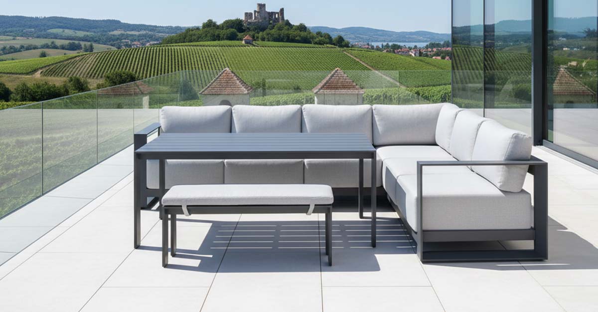 - Velký jídelní stůl: Hliníkový stůl o délce 170 cm nabízí dostatek prostoru pro stolování s celou rodinou. Jeho výška je navržena tak, aby perfektně ladila se sedací soupravou.
