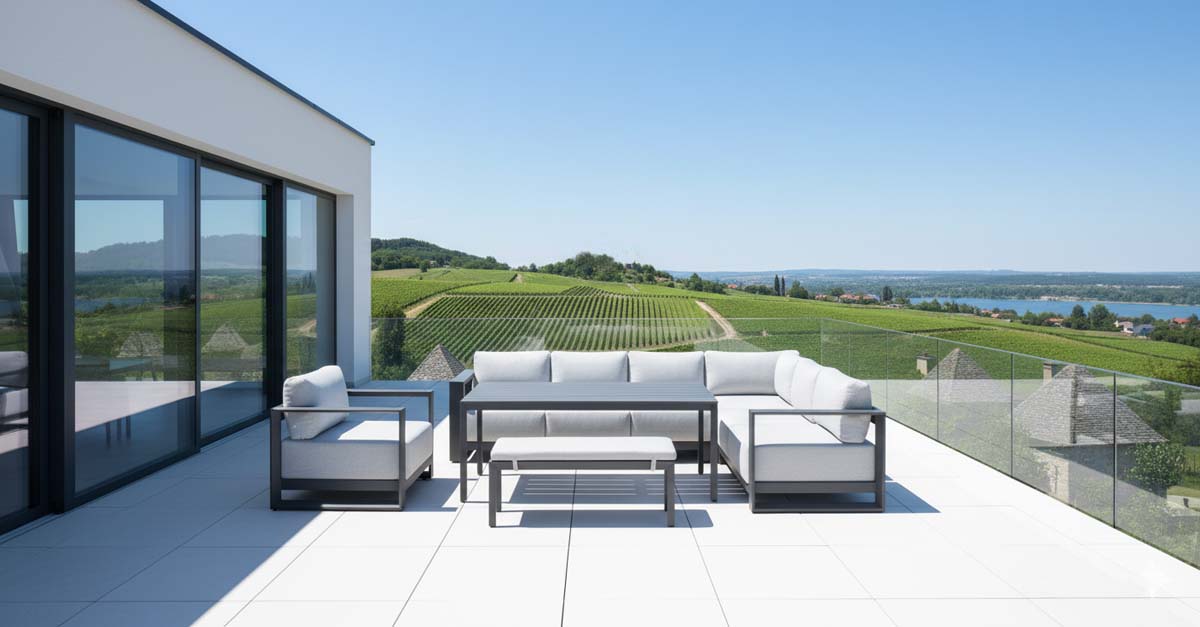 - Velký jídelní stůl: Hliníkový stůl o délce 170 cm nabízí dostatek prostoru pro stolování s celou rodinou. Jeho výška je navržena tak, aby perfektně ladila se sedací soupravou.