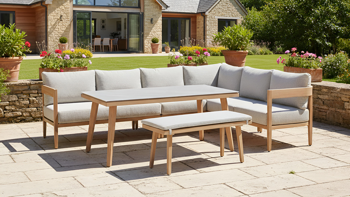 Zahradní sestava Hillston je navržena s důrazem na variabilitu. Skládá se z: pravého dílu pohovky, levého dílu pohovky, centrálního rohového modulu a středového modulu bez područek, kde díky tomuto chytrému prvku můžete pohovku snadno a rychle sestavit jako pravý nebo levý roh přesně podle dispozic vaší terasy. Součástí je navíc praktická lavice, která elegantně rozšiřuje počet míst k sezení a je ideální pro větší společnost nebo pro děti.