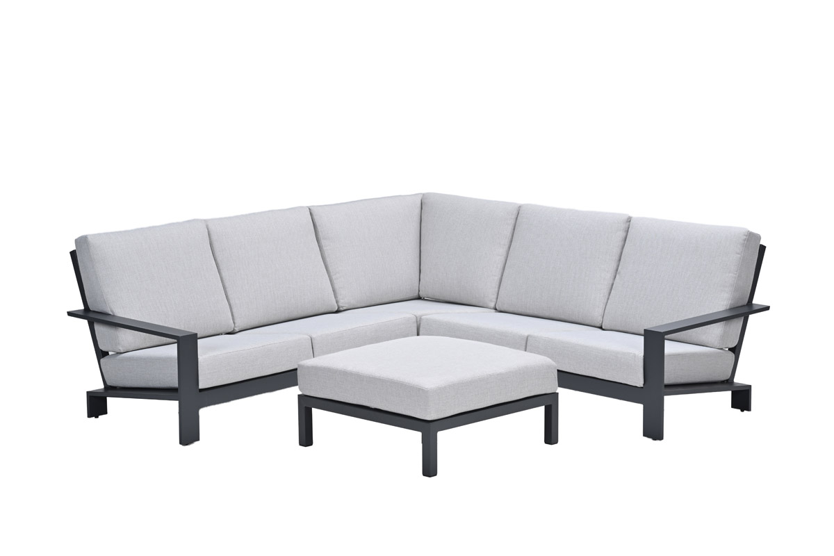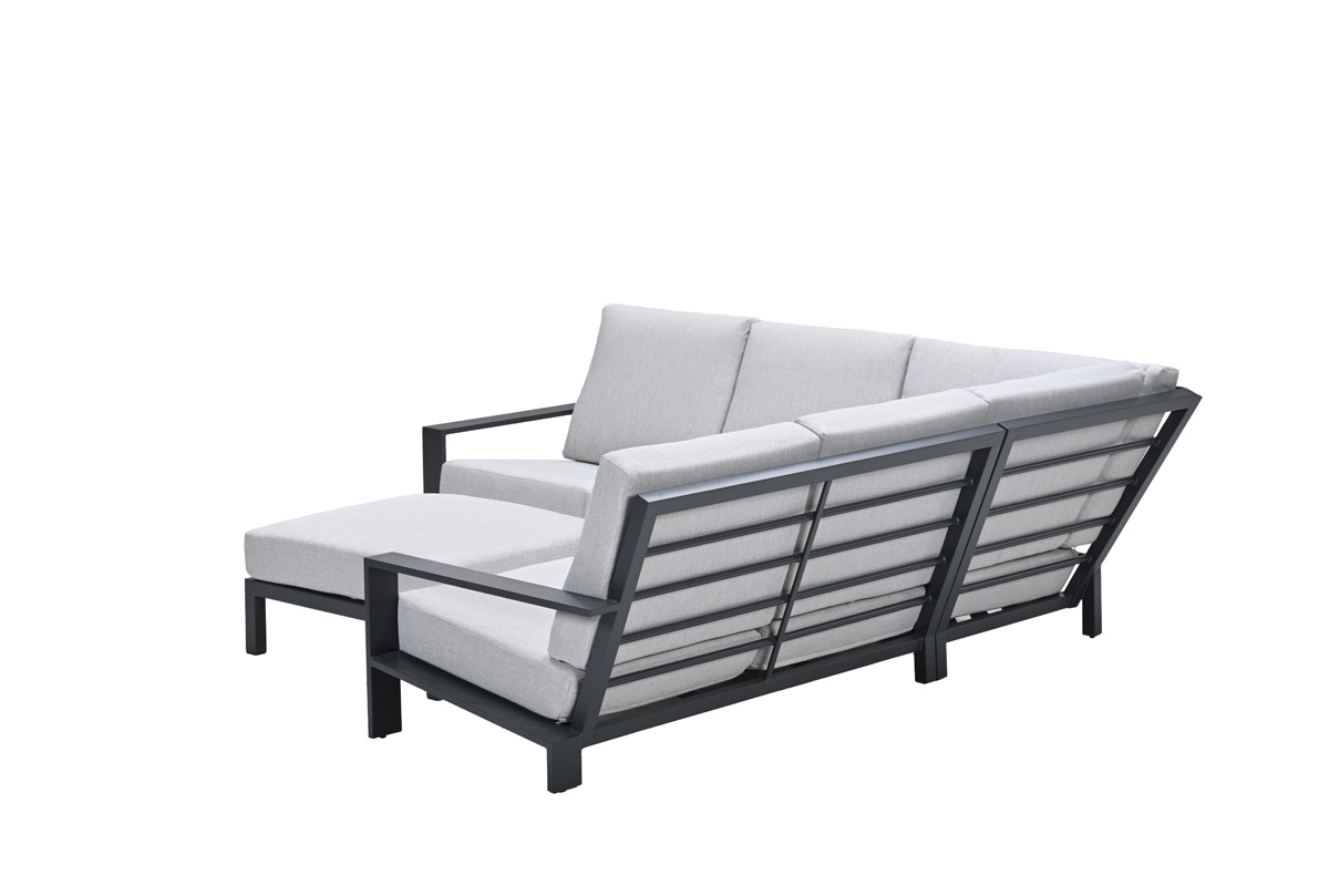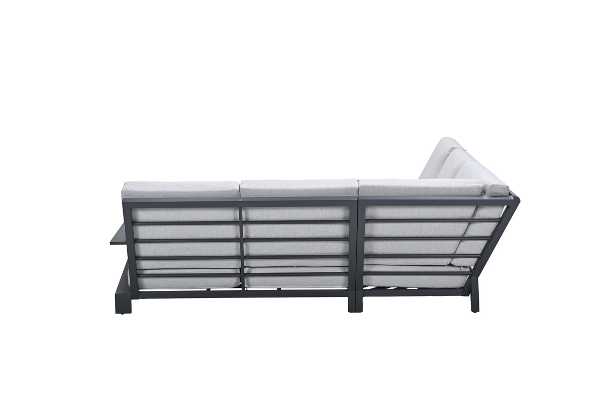 Hliníkový zahradní nábytek Vector Vám přináší maximální ergonomií: Vysoká zádová opěrka a sklon sedáků jsou navrženy pro zdravý a pohodlný odpočinek. Kvalitní odnímatelné polstry: Všechny polstry jsou potaženy kvalitní venkovní tkaninou Olefin. Jsou plně odnímatelné a opatřené praktickými zipy pro snadné čištění a údržbu. Modulární sestava pro 5 osob: Sestava obsahuje rohovou pohovku (pravou a levou), centrální rohový modul, samostatné křeslo a taburet, který poslouží jako podnožka nebo další místo k sezení.