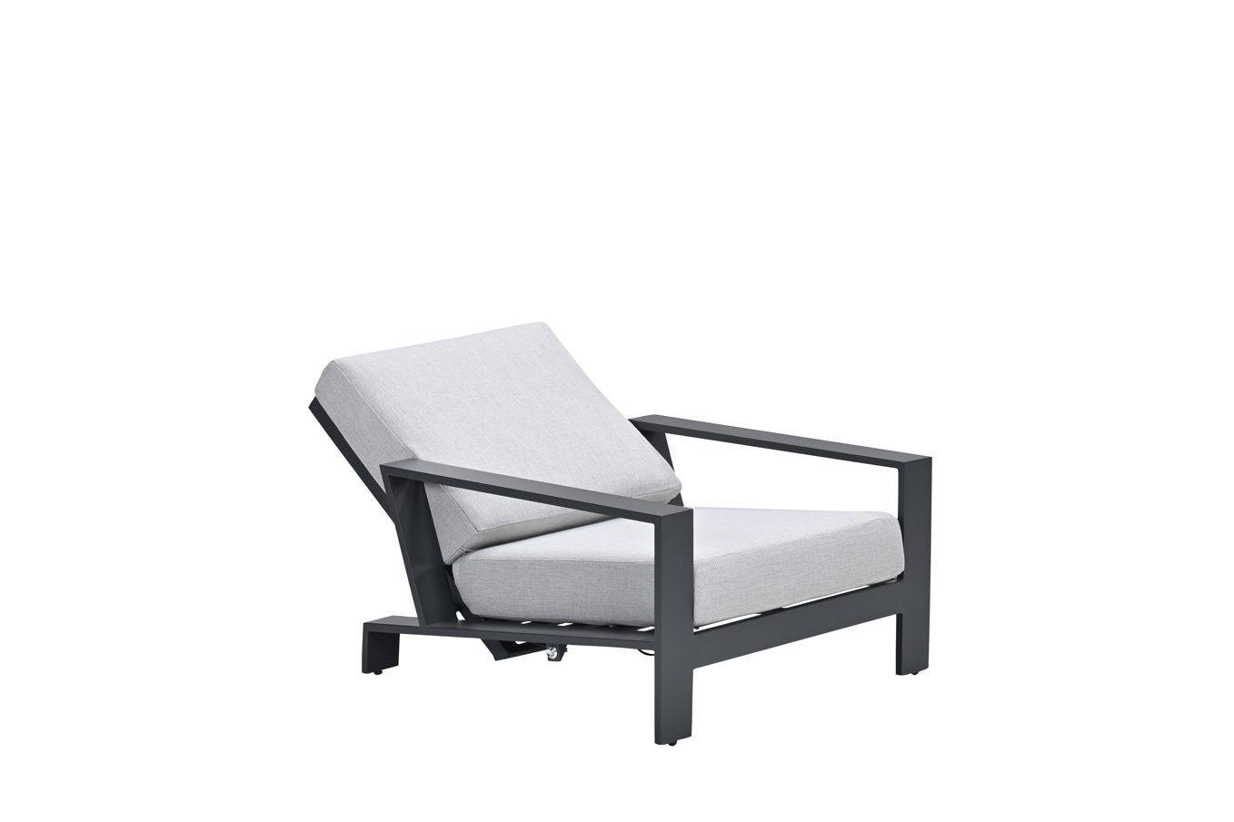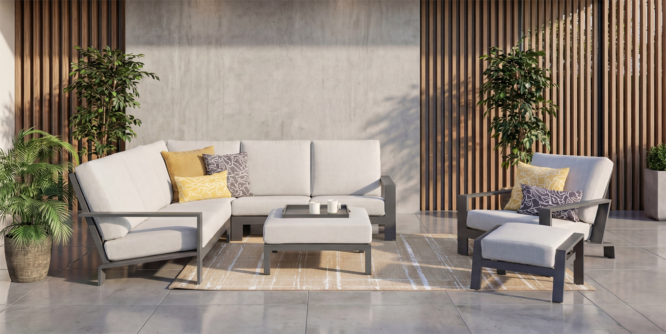 Zahradní nábytek s polohovacím křeslem Vector6 - dokonalé spojení moderního designu a ideálního pohodlí. Naše hliníková rohová zahradní sedačka Vector6 je navržena pro ty, kdo hledají nejen styl, ale i skutečnou ergonomii. Její hlavní výhodou je vysoká zádová opora s ideálním ergonomickým sklonem, která poskytuje páteři perfektní oporu a skvělá funkce polohování na zahradním křesle, které je podpořeno praktickou podnožkou, takže se z klasického křesla stavá pohodlné lehátko. Jedinečný je také mírný sklon sedacích ploch, který zajišťuje přirozené a velmi pohodlné sezení. Síla polstrů 12 cm a výška sedu 35 cm.