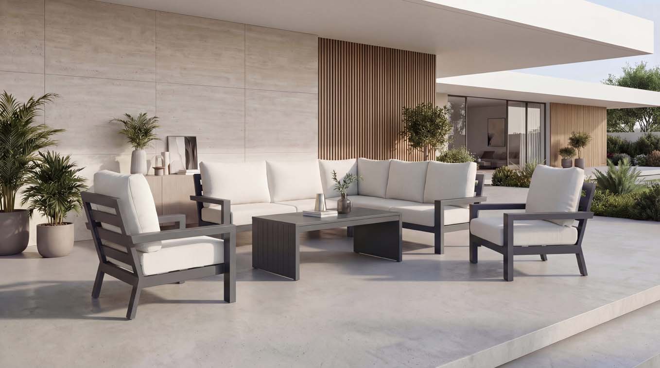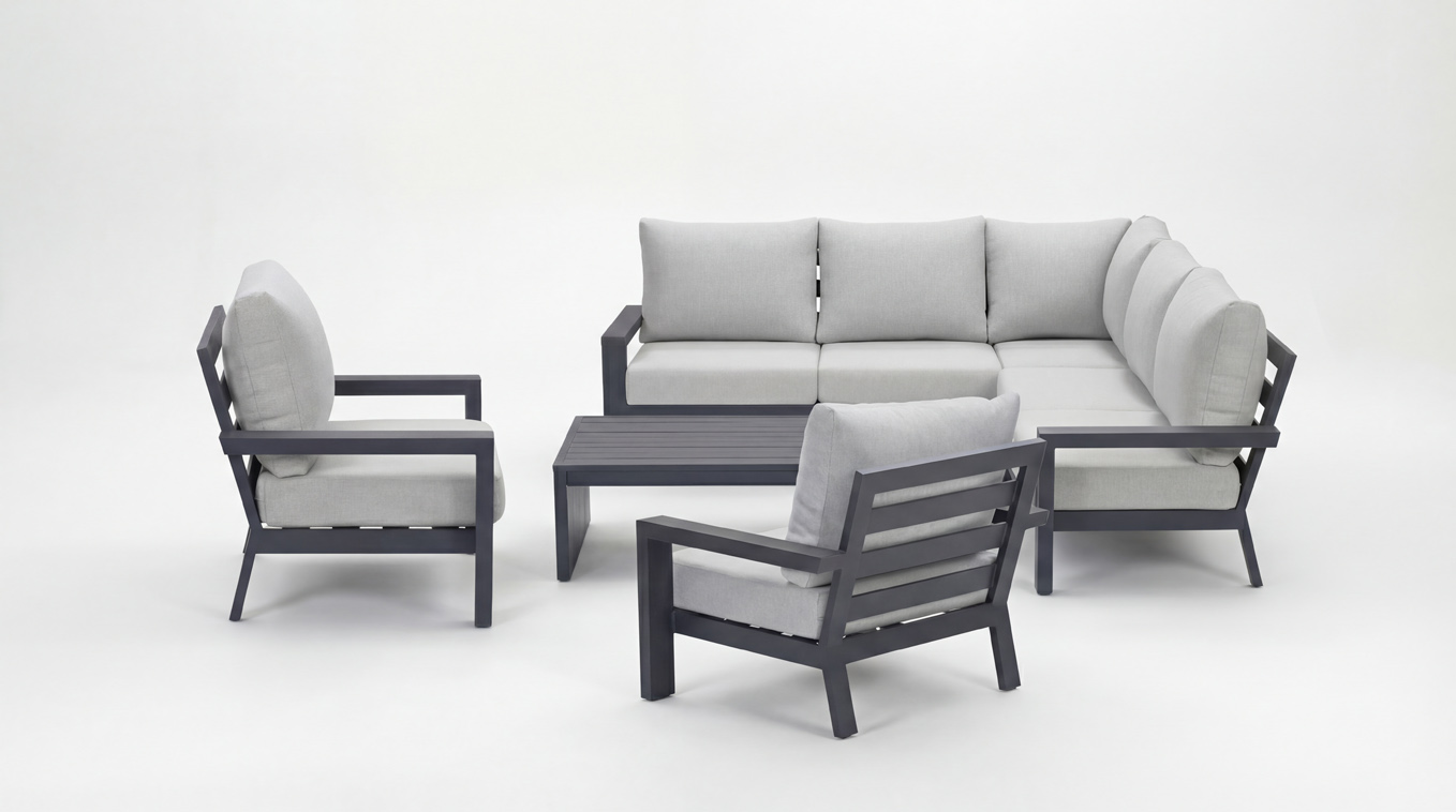 Prostorná zahradní sedací souprava Venue 7 plus se dvěma křesly a velkým stolem, je synonymem pro variabilitu a relaxaci. Souprava dominuje širokými, odnímatelnými sedáky a silnými polstry opatřenými zipy pro snadnou údržbu, přičemž potahová látka Olefin zaručuje vysokou odolnost. Odolný robustní hliníkový rám zajišťuje dokonalou stabilitu tohoto zahradního setu. Celý set doplňují dvě velká prostorná křesla a elegantní hliníkový konferenční stolek pro dokonalé letní posezení.